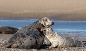 Uma foca e seu filhote em Blakeney Point, cuidado pelo National Trust.
