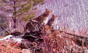 Uma jovem fêmea de leopardo de Amur com três filhotes no Parque Nacional Terra do Leopardo, no extremo leste da região de Primorye da Rússia, na fronteira com a China. Fotografia: The Land of the Leopard National / AFP / Getty Images