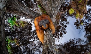 Thomas Vijayan foi nomeado o fotógrafo da natureza mundial do ano por sua foto do orangotango de Bornéu (acima) intitulada ‘O mundo está de cabeça para baixo’.