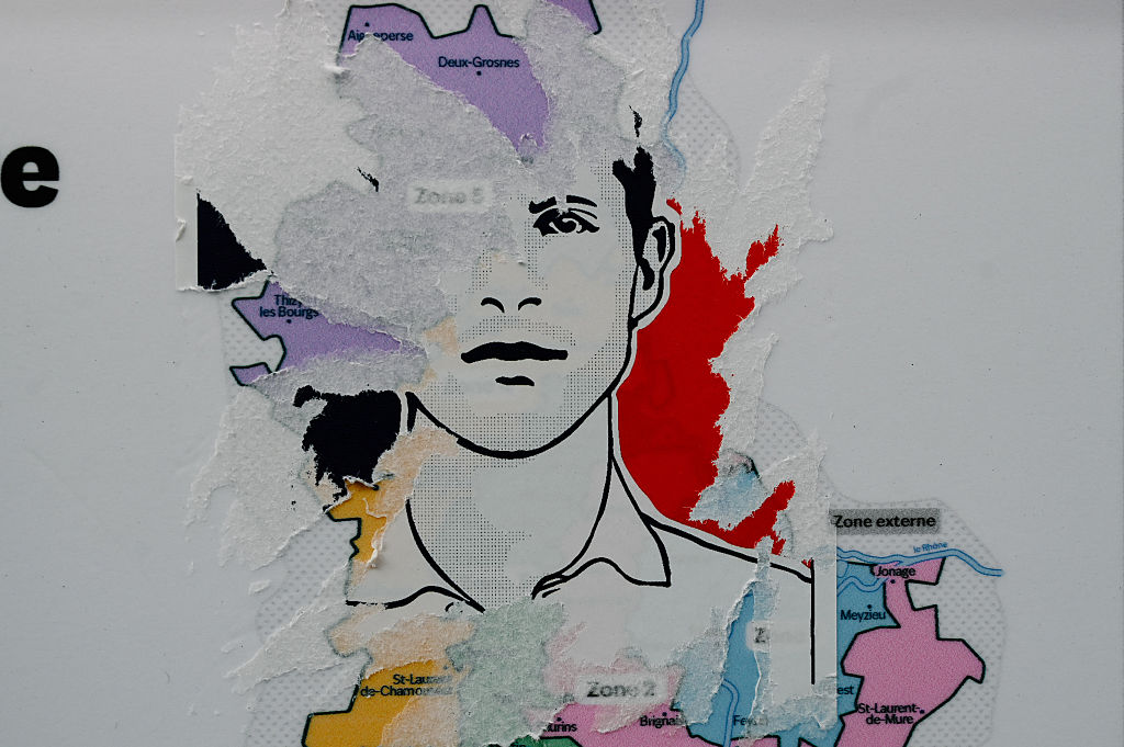 Por: Phineas Rueckert | Tradução: Pedro Silva| Crédito Foto: Matthieu Delaty/Hans Lucas/AFP via Getty Images. Um adesivo parcialmente rasgado com o retrato do ativista de extrema-direita Quentin Deranque colado em um mapa da região metropolitana de Lyon