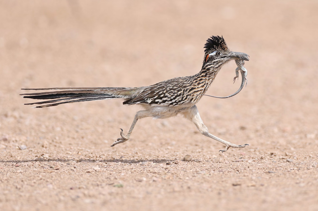 Por: Pejman Faratin | Crédito Foto: Christian Petersen/Getty Images. Um papa-léguas-gigante foge em disparada durante um torneio de golfe em Phoenix, Arizona.